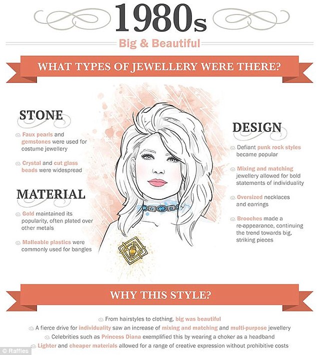 在這段時間的女人都是誇張的髮型,隨著80年代的朋克音樂浪潮,珠寶變得極度浮誇,像希瑟·洛克萊爾(Heather Locklear)的明星們會穿戴人造珍珠,超大項鍊和耳環,胸針,金色和更便宜的材質。
