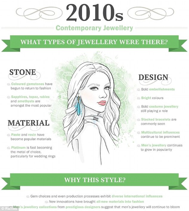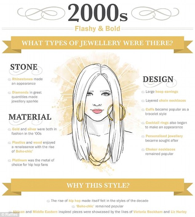 二十世紀的女性喜歡大膽的珠寶,包括大圈耳環、分層連衣裙項鍊個性化首飾和巧克力依然受歡迎,嘻哈音樂影響了珠寶趨勢,像維多利亞·貝克漢姆和麗莎·赫利(Liz Hurley)等明星們展出了非洲和中東的靈感。 梅根·福克斯這樣的明星將穿鑽石,水鑽,袖口,塑料和木頭,充滿“Boho-chic(融合波希米亞和嬉皮的風格)”。