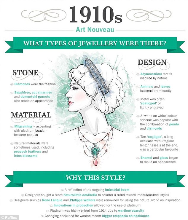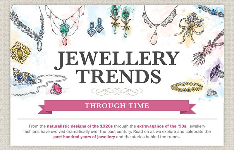 配戴的珠寶可以表現出個人獨特的風格與魅力,但流行與趨勢的改變仍影響大家挑選的款式風格,從1910年代的新藝術風格到1970年代的波希米亞風格,再到2010年代的大膽誇張的珠寶風格,隨這時間的流轉產生了巨大的改變,現在就讓我們一起來回顧過去100年最獨特的珠寶潮流。