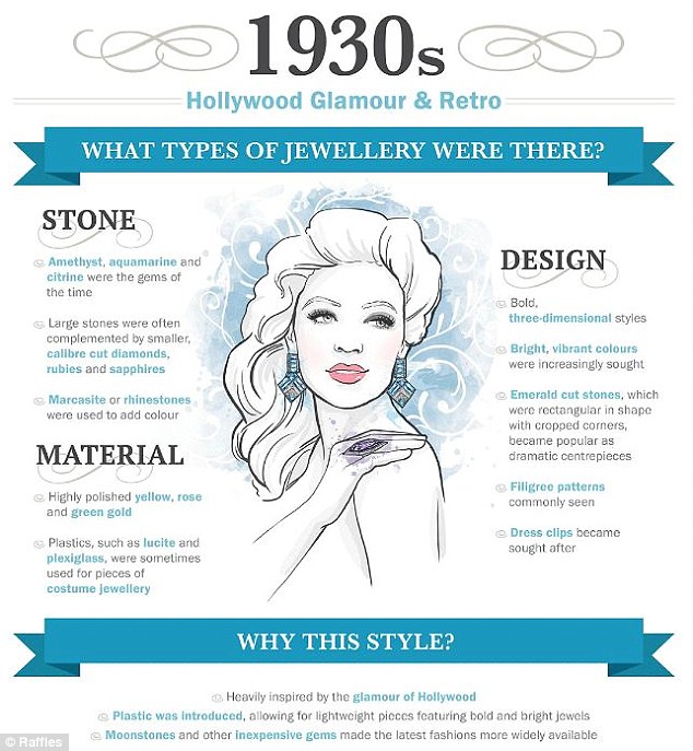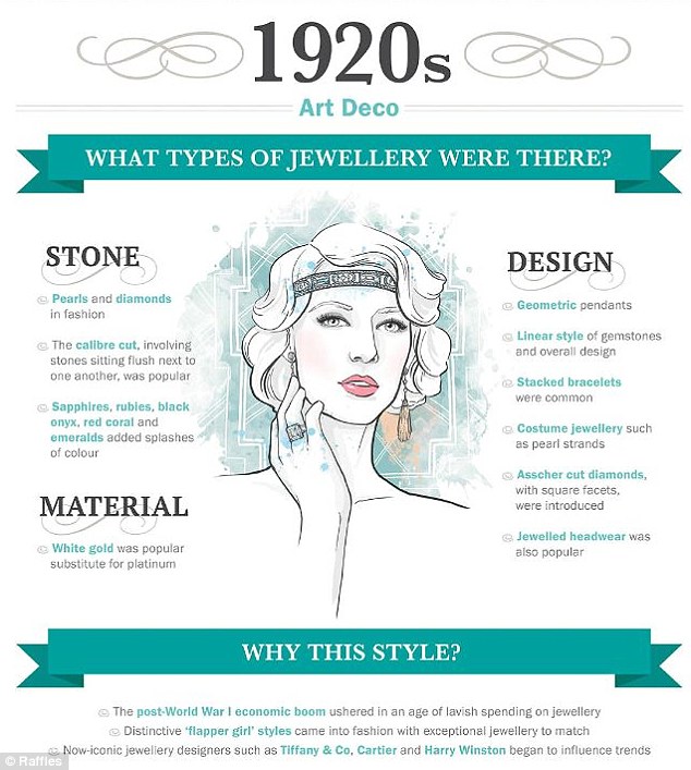 在第一次世界大戰後經濟繁榮,女性花在珠寶上的錢比任何時候都來的多,包括藍寶石、祖母綠、珍珠和鑽石、白金,可從首飾、頭飾、推疊的手鐲看出他們對珠寶的熱愛