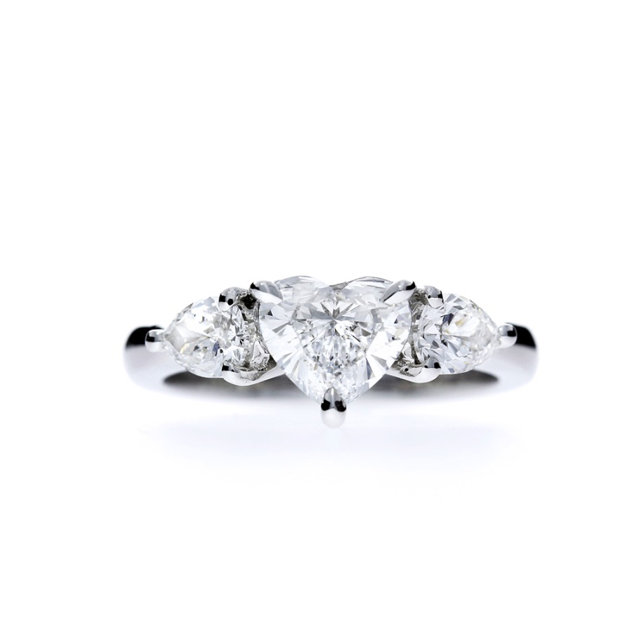 將三顆鑽石鑲嵌於一枚貴金屬戒環,分別代表過去的回憶、現在的禮物和你未來的喜悅,鑽石大小可以相近,或以一顆較大的主石居中。