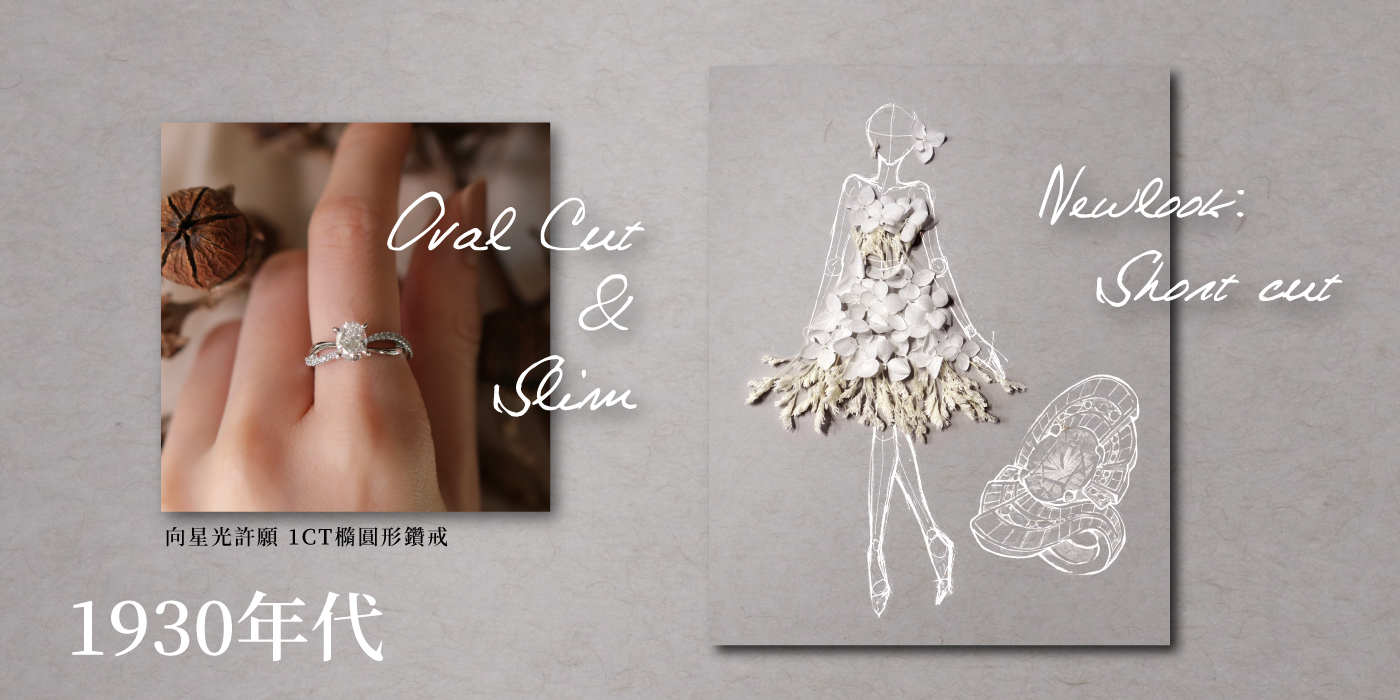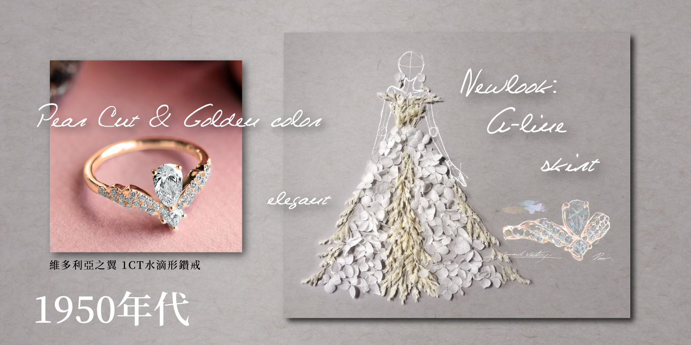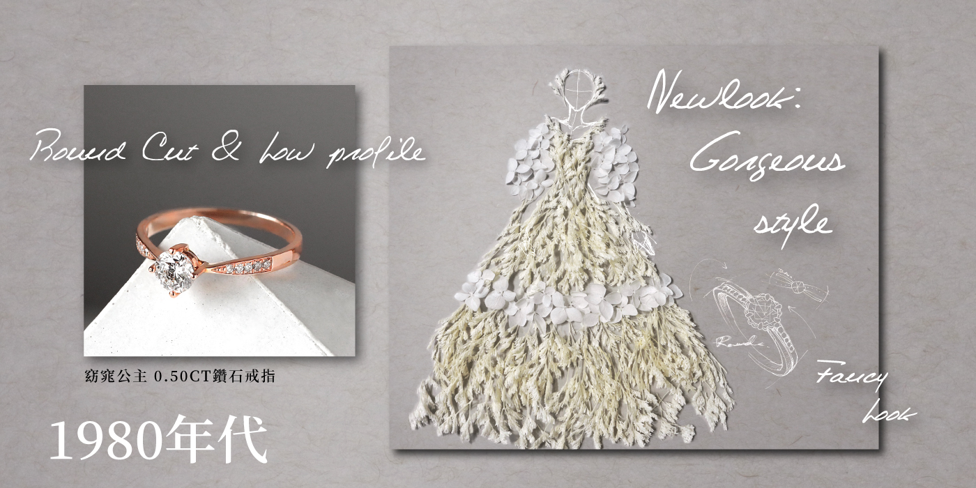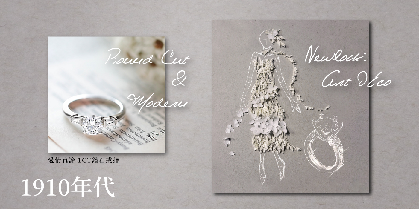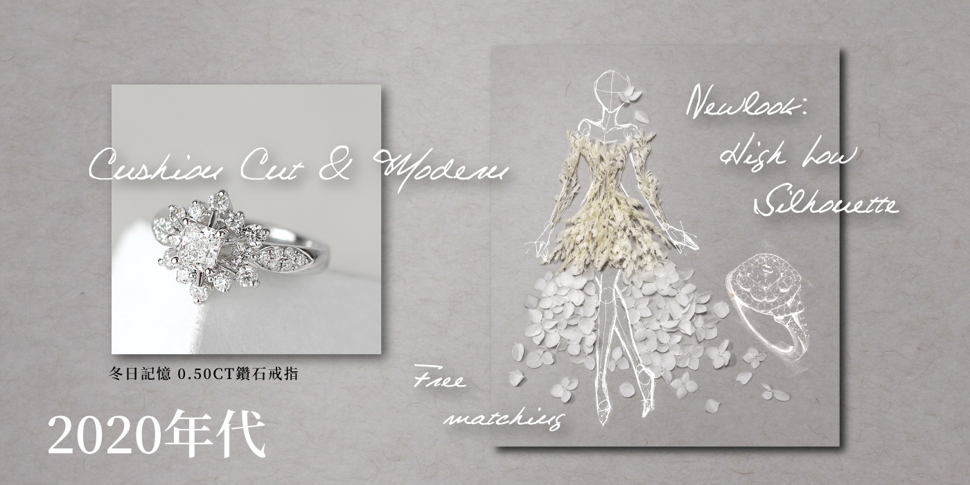 每個年代的鑽戒與婚紗,都有其趨勢與新發明,也與當時的社會環境與進步條件互相影響,有時則是藉由過去的經典架構,去變化嶄新的樣貌,漸漸演變到現在多元的風采。你最喜歡什麼樣的鑽石戒指呢?又或是哪個年代的婚紗風格呢?
