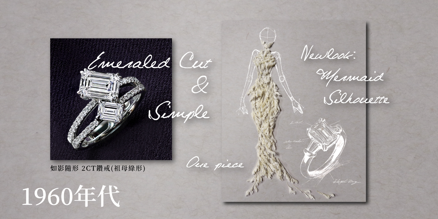 比基尼!就是在這個年代出現的,也是時尚 Icon – Barbie 竄紅的年代,能夠展現優美曲線的 One Piece 裙裝版型亦流行了起來。在充滿女性特質的風格上,可以搭配線條簡約明亮設計的祖母綠形鑽石。