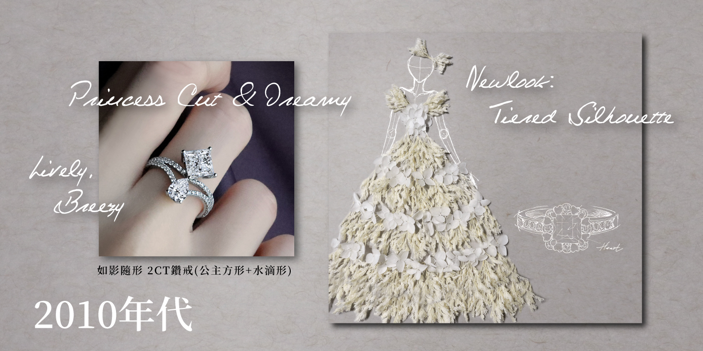 2010 年代是科技產品、社群網路開始爭相發展的年代,可以看到多種繽紛的設計,其多樣的堆疊特性也呈現在婚紗上,如同蛋糕層次般活潑的氛圍。閃耀的設計很適合公主方形切割款式,在這樣的搭配下,則需搭配裸色低調指彩,讓搭配焦點較為及集中 。