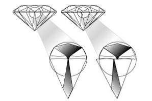深及窄是各種形體聚色的必要條件,深代表底部深度;窄代表桌面大小。另外影響聚色的因素就是冠部及下腰面的角度,越平越不易聚色,但底部太深或桌面太小卻又嚴重損及鑽石火光,所以切割師必須一邊切磨一邊調整,不斷地在顏色及火光中取得平衡。