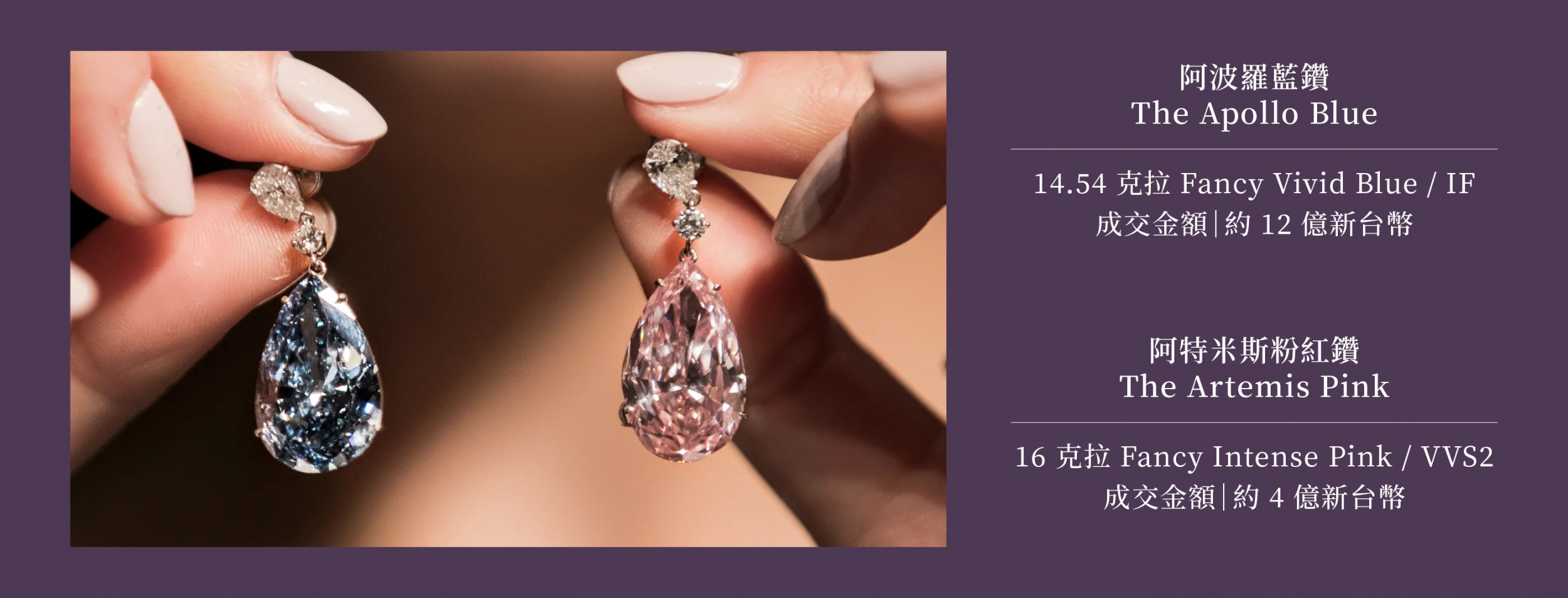 2017 年 5 月蘇富比日內瓦「瑰麗珠寶及貴族首飾」拍賣會上,以這對水滴形切割鑽石耳環最受矚目。這對耳環是 Fancy Vivid Blue / IF, 14.54 克拉的「阿波羅藍鑽 The Apollo Blue」以及 Fancy Intense Pink / VVS2,16 克拉的「阿特米斯粉紅鑽 The Artemis Pink」。藍鑽以新台幣約 12 億成交,粉紅鑽則以新台幣約 4 億落槌,這驚人天價不難想像各國富豪對於彩鑽的傾心嚮往。