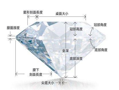 ◎切磨比例(Proportions): 鑽石切磨比例乃指各部份尺寸、角度之相互關係,雖不如其外形明顯,對整體美來說,卻更重要,因其決定鑽石光學特性之發揮程度。