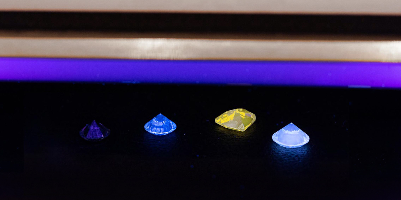 約有三分之一的寶石級鑽石在紫外線長波( 366nm,單位奈米)照射下會產生螢光反應, GIA 國際證書上會將其顯示出來。