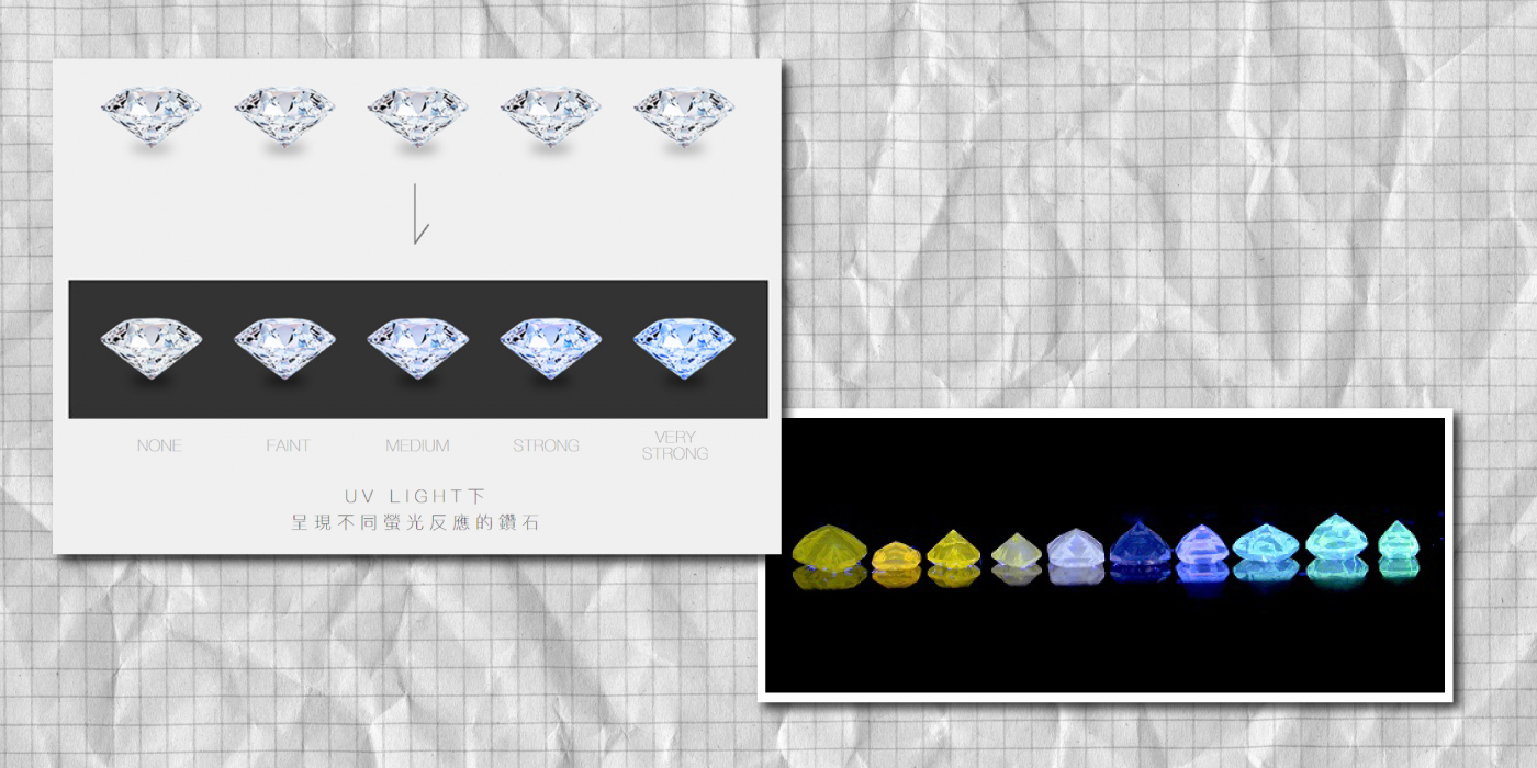 1-影響火光:白鑽顏色等級越高( D 、 E 、 F )的鑽石若具有螢光反應,鑽石上的白霧朦朧感會更明顯,進而影響透明度和亮度。