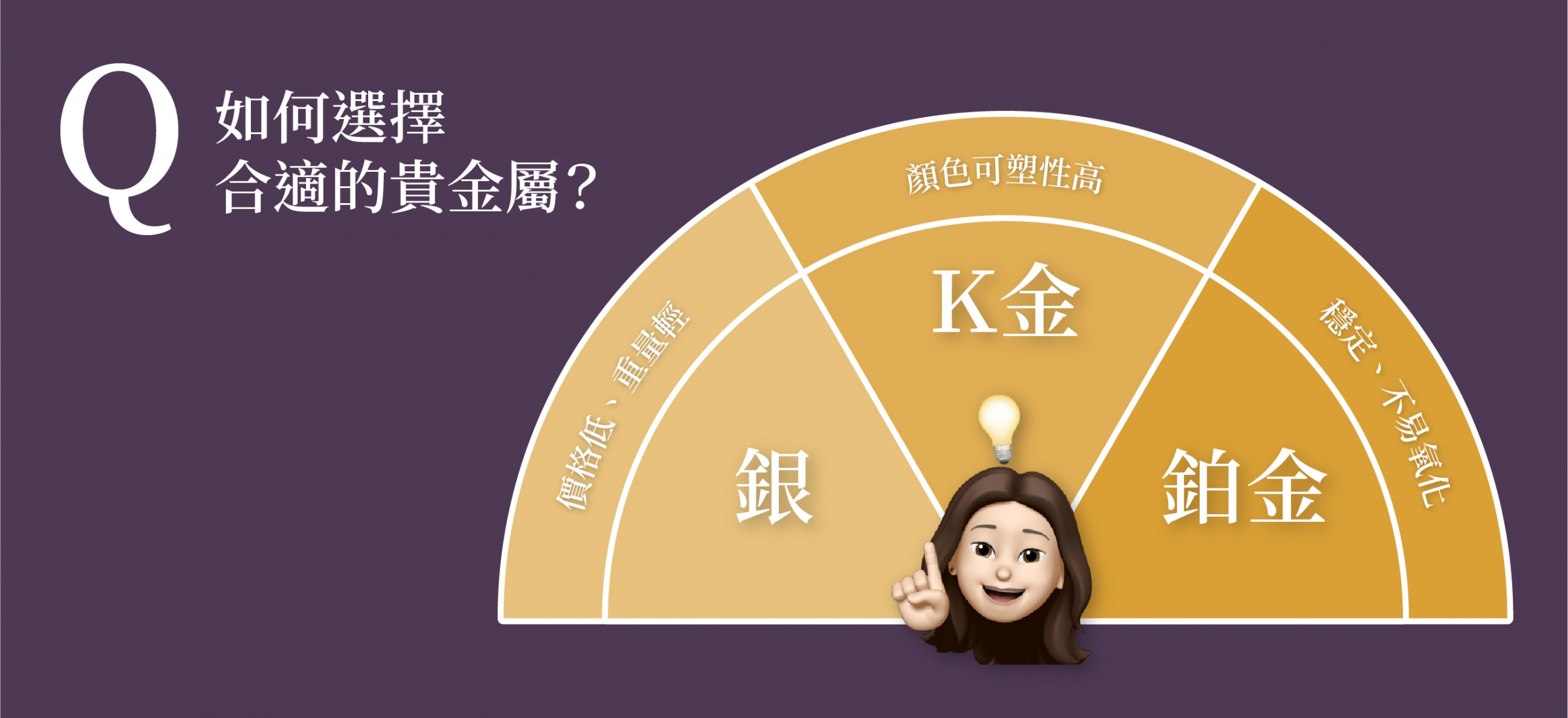 而在選購 K 金飾品時,若只考慮到價值而選擇含金量極高的 K 金,則會有堅硬度不足的問題,18K 金和 14K 金在價格及堅硬度上取得完美平衡,成為普遍消費者的首選。除此之外,K 金在色澤上可塑性高,可以根據自己膚色條件偏冷或偏暖來選擇白 K 金或玫瑰金來襯托,選擇上有較多彈性,同時也是 K 金大受歡迎的原因之一。