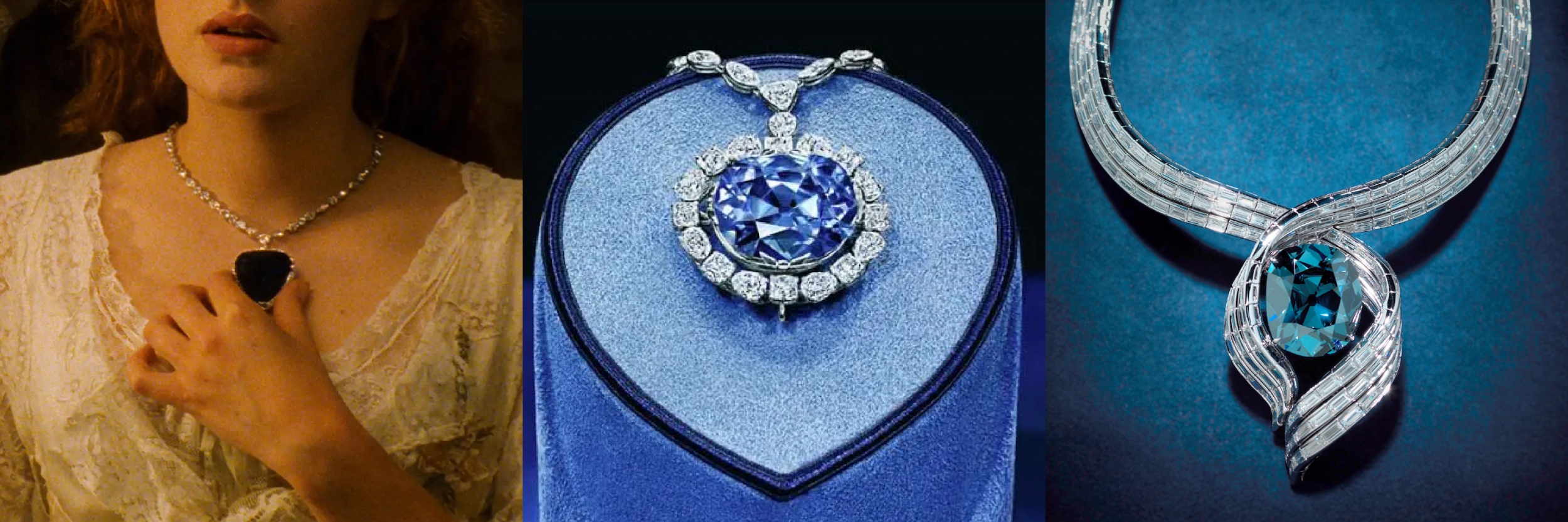 電影《鐵達尼號》中的「海洋之心(Heart of the Ocean)」是一顆虛構的藍鑽,由英國珠寶商 Asprey & Garrard 使用半寶石 —— 丹泉石,所打造的電影道具,當時一共製作了三條相同的寶石頸鍊。然而你知道嗎?海洋之心的設計靈感是來自於一顆真實存在的藍鑽,那就是著名的「希望鑽石(Hope Diamond)」。