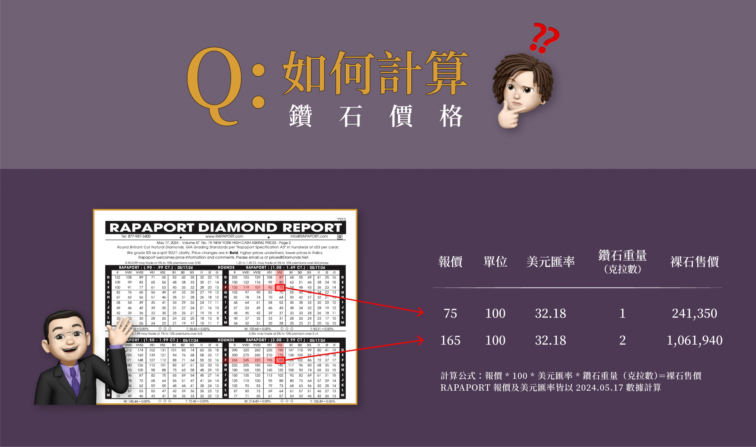 公式:報價 ✕ 100 ✕ 美元匯率 ✕ 鑽石重量(克拉數)=裸石售價