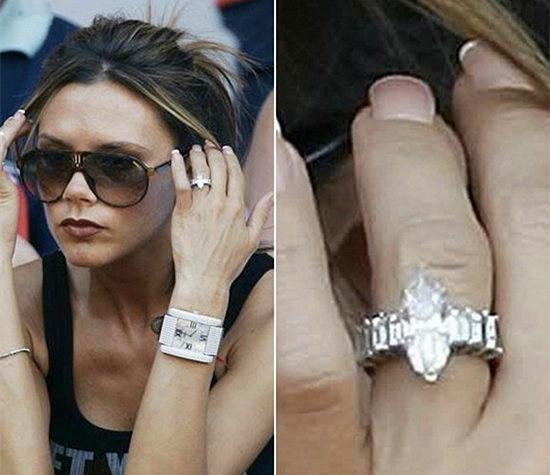 1998年,當大衛·貝克漢姆向維多利亞·貝克漢姆求婚時,貝嫂維多利亞佩戴一枚鑲嵌著馬眼型鑽石的黃K金鑽戒,價值6.5萬英鎊。