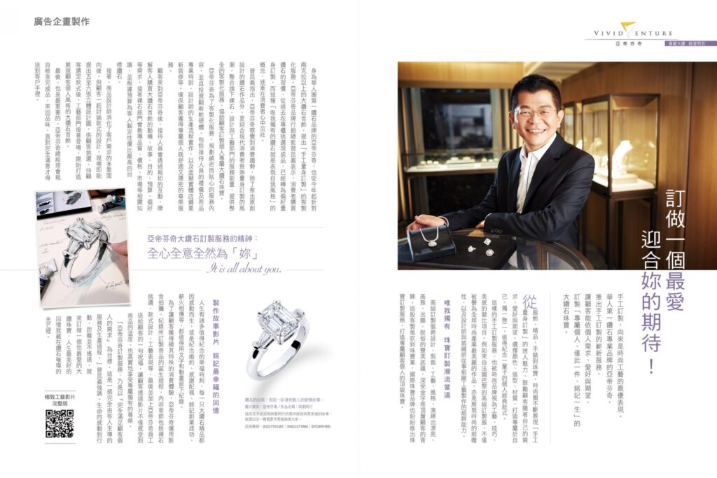 手工訂製向來是時尚工藝的最優表現,華人第一鑽石專業品牌的亞帝芬奇,推出手工訂製的服務,讓顧客能依個人需求、愛好與期望,訂製「專屬個人、僅此一件、銘記一生」的大鑽石珠寶。