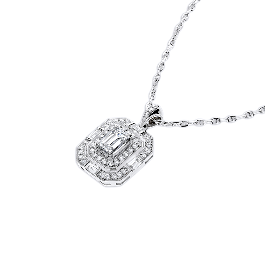 運用圓型與祖母綠型鑽石與金屬搭配,將城市建築中的玻璃帷幕,以幾何拼接呈現頸間優雅和俐落的時尚感。
