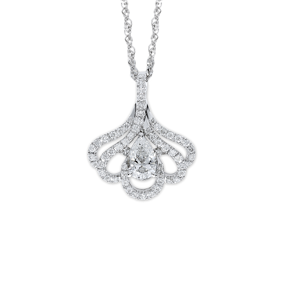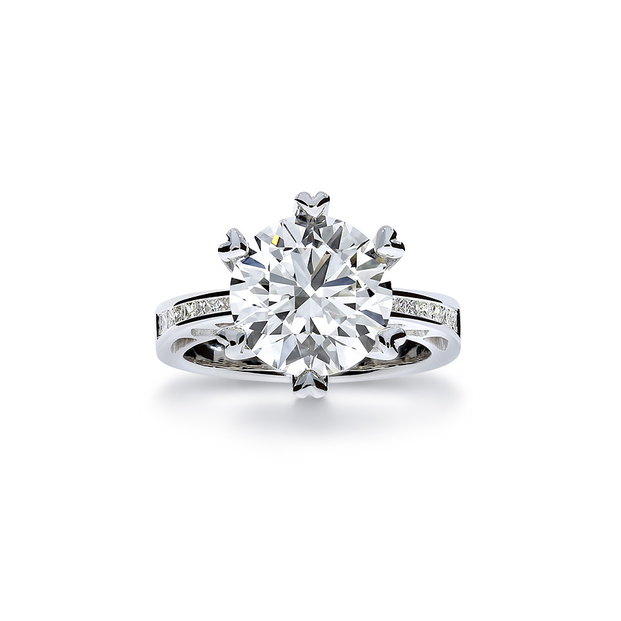 心型爪鑲如同愛神邱比特心之箭,眾星拱月之姿,襯托圓鑽大器之美;圓鑽綻放的光彩宏偉明亮,令人讚嘆。