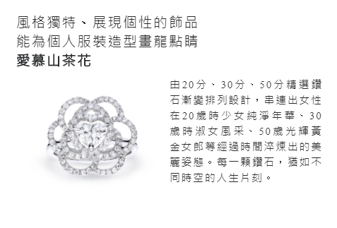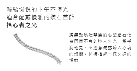 參加下午茶聚會,與好友見面聊天,服裝穿著以輕鬆的休閒風格為宜。這時配戴的大鑽石首飾,可選擇展現個人氣質的水滴形,或是經典不敗又洋溢熱情的心型、圓形主石為主,而整體造型若採用主石可分離、飾石可活動的多變化設計,將為配戴者的品味大大加分。