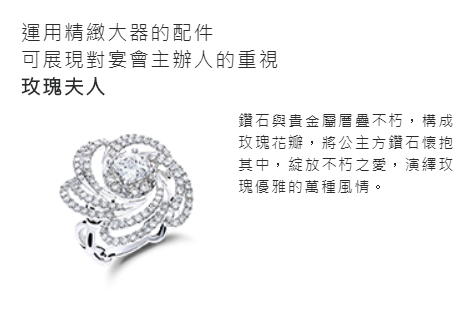 年輕的女性創業家參加慶功宴、晚宴等正式宴會場合,多選擇造型簡雅、俐落的黑色小洋裝或小禮服,展現輕快的時尚品味。在這樣的場合裡,適當配戴花朵造型的鑽石胸針、設計精緻的鑽石耳環或戒指,既能對主辦者表態自己重視宴會的真誠心意,又能打造自己在隆重場合的專業形象。