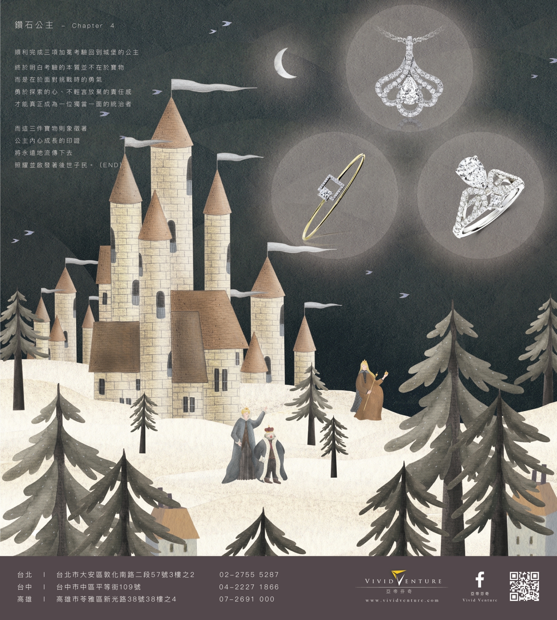 順利完成三項加冕考驗回到城堡的公主,終於明白考驗的本質並不在於寶物,而是在於面對挑戰時的勇氣、勇於探索的心,不輕言放棄的責任感才能真正成為一位獨當一面的統治者,而這三件寶物則象徵著公主內心成長的印證,將永遠地流傳下去 照耀並啟發著後世子民。(END)