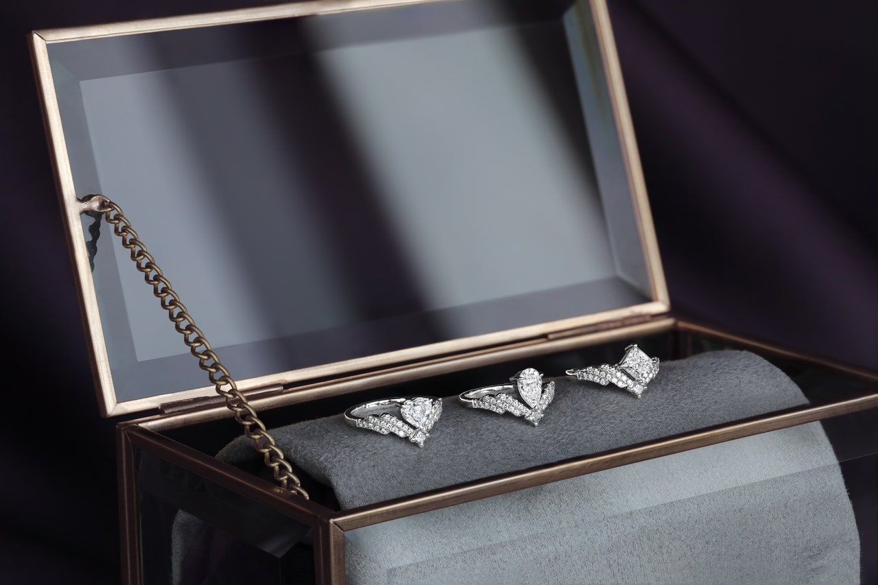 巴黎羅浮宮充滿力與美的「薩默特拉斯的勝利女神」,受喻為希臘最偉大的雕塑,淬礪千年歲月,依然震懾動人。【維多利亞之翼系列】以華麗璀璨的勝利女神為設計靈感繆思,她豐厚向上展開的雙翼,閃爍著不朽光芒,更象徵勝利與幸運,如同你與她的相遇,他就是為妳帶來希望的幸運女神。指戒的雙翼造型同時融入 VIVIDVENTURE的品牌字⾸V隱喻展翅飛向未來的雙翼,也代表勝利的V,搭配各式不同切割的花式鑽石,展現摯愛女神的獨特個性。