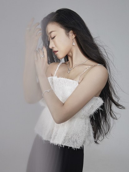 初綠鑽石套鍊,以新綠初發,綣曲嫩芽蔓生的意象為主題,輕盈地落在頸間;米迦勒之翼鑽石耳環,則透過花式鑽石拼接設計,展現如羽翼般光明且自由, Vividventure 亞帝芬奇的鑽飾作品對應著季綾,似是記錄著她重新開始、將更活躍綻放的人生階段。