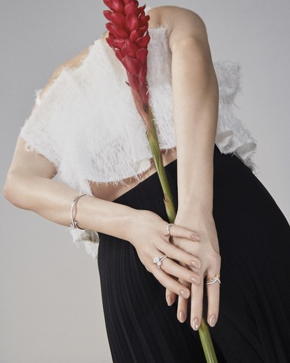 普羅旺斯夏日鑽石套鍊、米迦勒之翼鑽石耳環,左手/ 光之穹頂鑽石戒指、星光系列鑽石線戒,右手/ 星光系列鑽石手鍊、燦爛花火鑽石戒指