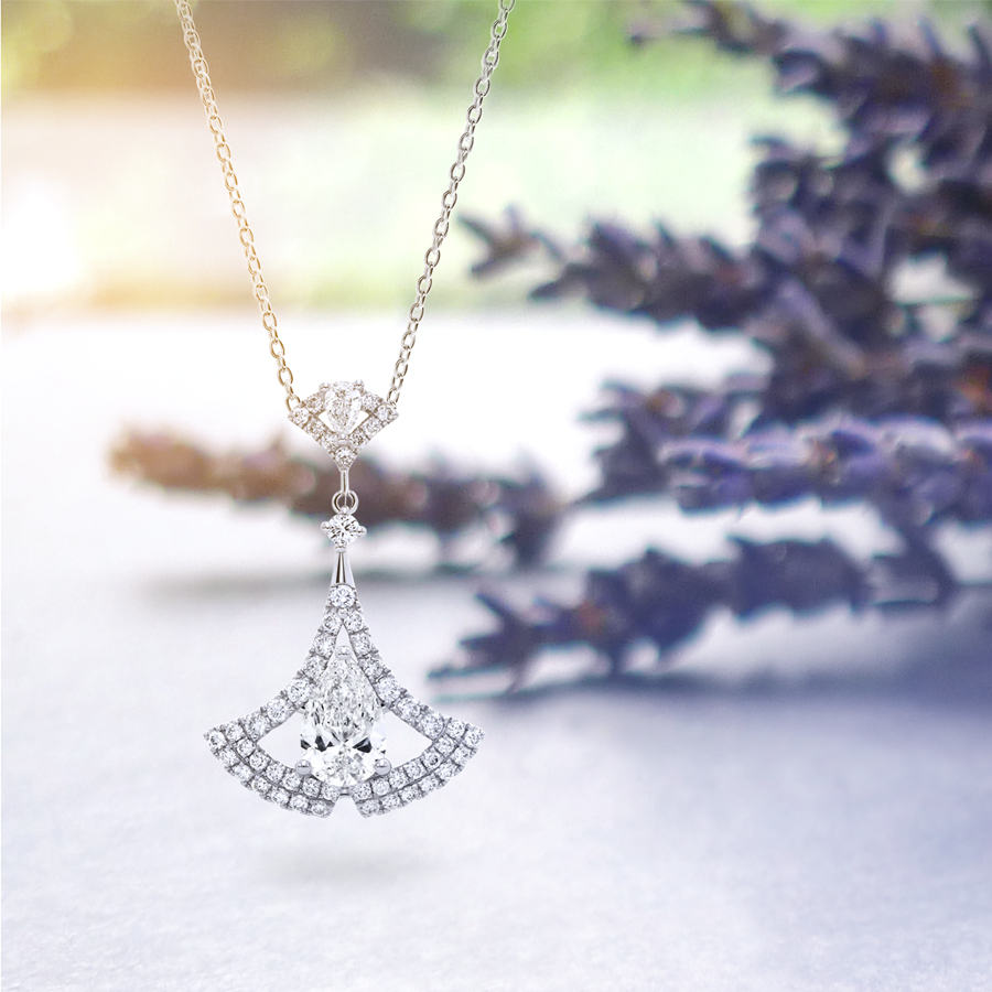 靈感源自銀杏的自然姿態,融合水滴形車工的靈動線條,每一道切面都折射出柔和光彩,如陽光下閃爍的水滴般動人。