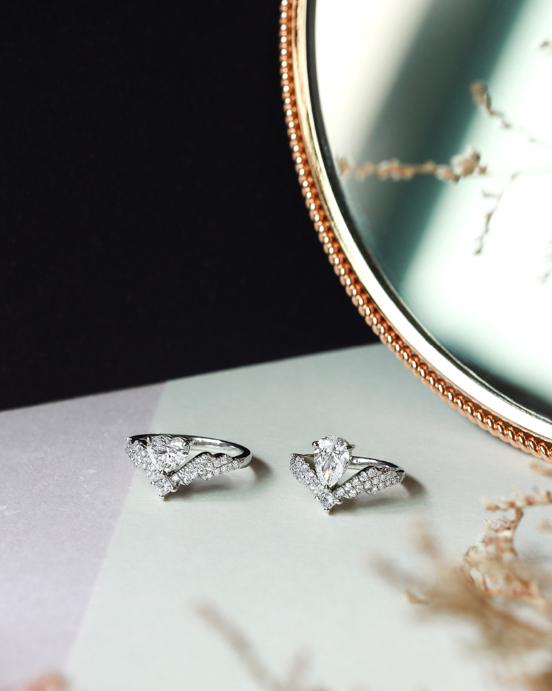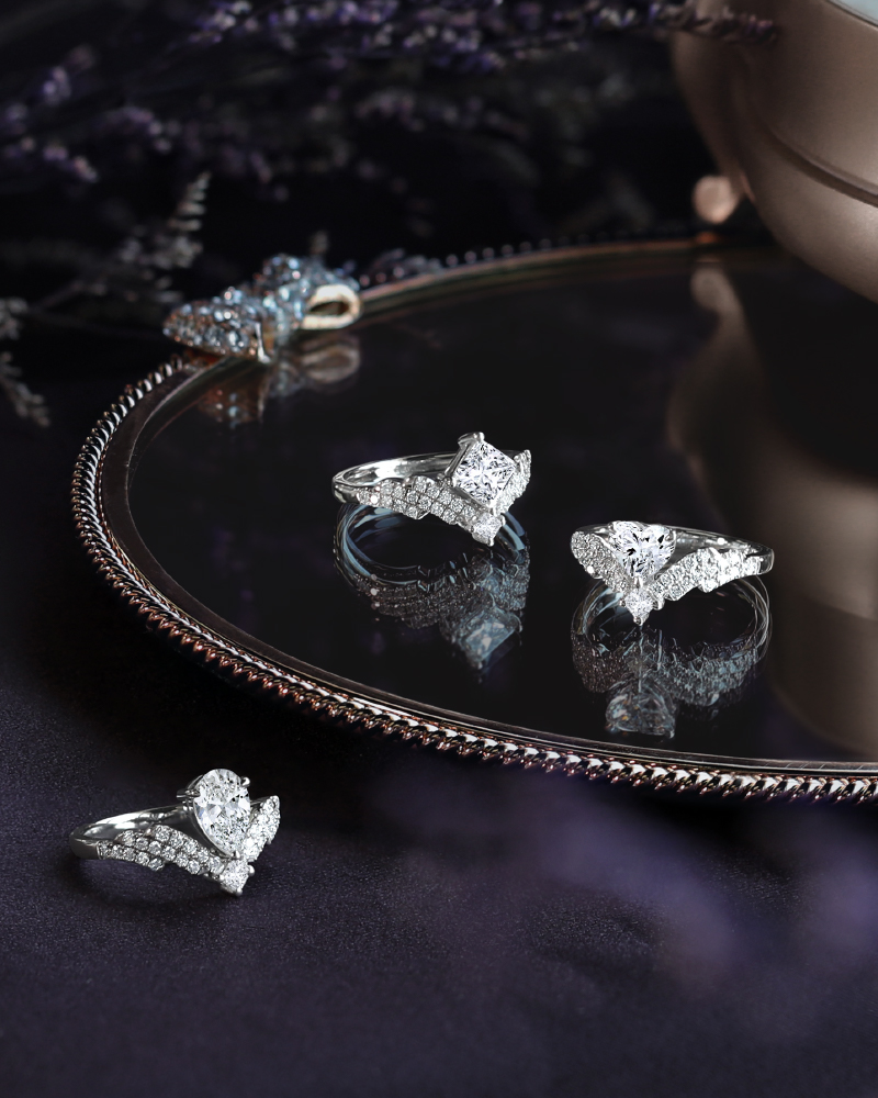 水滴形的主石,閃耀光輝;心形切割,象徵永恆;公主方形,散發榮耀。
