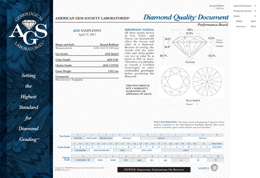 1996年開始,重視車工(Cut)的AGS證書成為國際鑽石業界車工的標準,車工等級為0的鑽石更是鑽石車工極致的表徵,如果有三個0,即表示該鑽石比例(proportions),拋光( polish)及對稱(symmetry)均是完美,是鑽石車工的完美之極限!