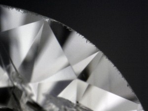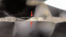 ( 10 )瘀痕(Bruise)鑽石表面受外力撞擊形成的根部伸入到鑽石內部的痕跡。擊傷痕通常為白色,具一定的幾何形態,伴有與裂紋的微小區域,一般見於刻面交接處。