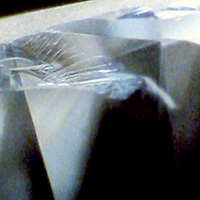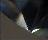 ( 5)鬚狀腰圍(Bearded girdle)存在於腰部的鬚狀微裂紋深入內部的部分,形似老人的鬍鬚。它是由於過激的粗磨造成的。粗糙腰圍與其成因相似,但粗糙腰棱有砂粒感,常伴有很小的缺口。