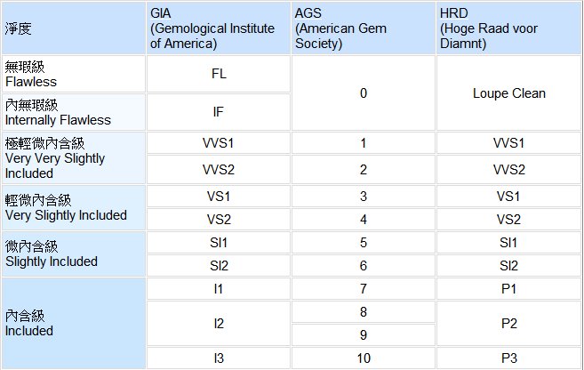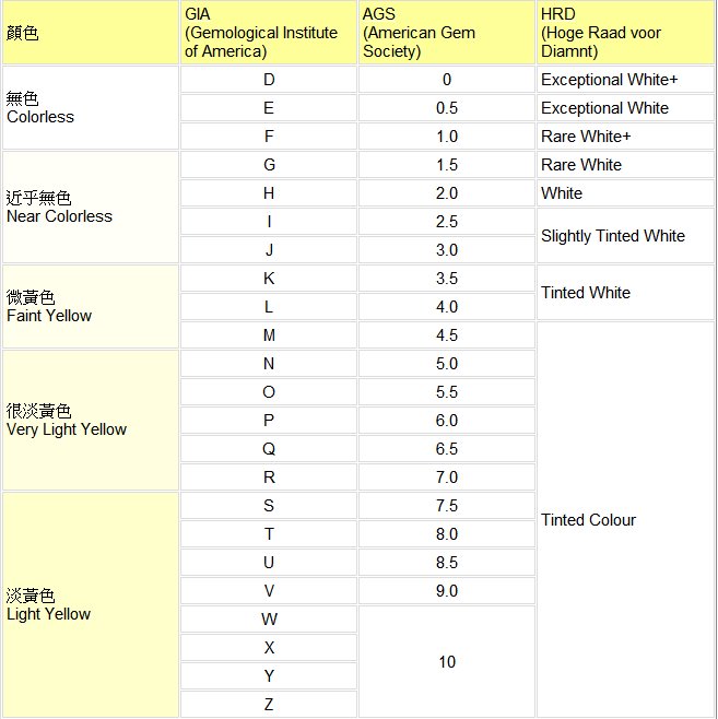 國際評定鑽石等級,主要以鑽石重量、鑽石顏色、鑽石淨度以及鑽石切工為標準,不同的等級對價格也有一定影響,但你知道國際評等有分成GIA、AGS、HRD等不同鑑定標準嗎?下面就為您圖示各鑽石等級的對照表。