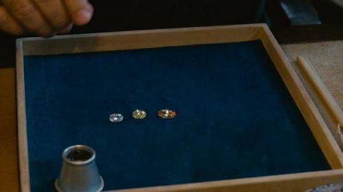 印度人一開始給王佳芝看的幾個鑽石,黃黃綠綠,顏色都不討喜,確實沒多少吸引人的地方,印度人也自知理虧,所以拿了個比較特別的(意思就是比較貴啦!)。