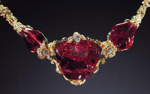 鑲嵌 泰米爾紅寶石 的項鍊,鑲嵌的巨粒紅寶石都是紅尖晶石,中間最大的一粒重352.5克拉,它就是我們“鴿子蛋”家族中的泰米爾紅寶石了。