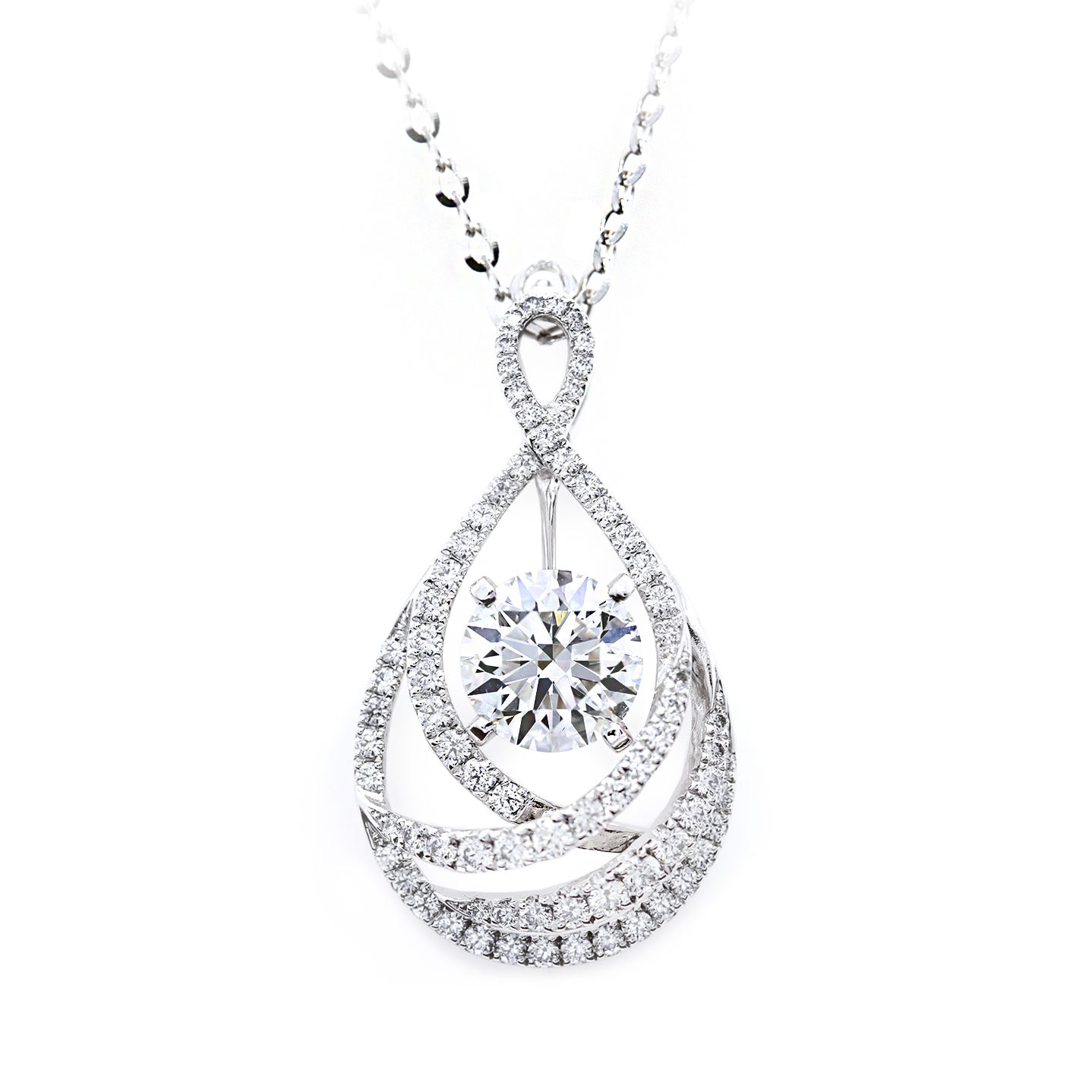 單顆美鑽穿行於鏤空密鑲鑽石交會呼應,有如水與光的巧妙交會,演繹每個值得被紀念的臻愛時光,化身成女人頸間最堅定美麗的承諾,有如一輩子永遠掛在心頭的愛。