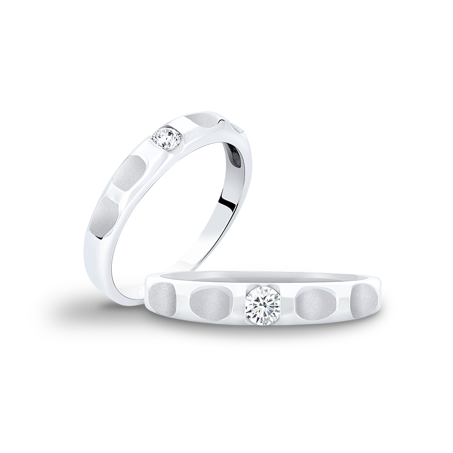 此款為圓鑽車工,戒指拋光與拉絲的雙重結合與凹槽設計帶來豐富層次變化,寓意戀人攜手走過人生的每步軌跡都別具意義。
