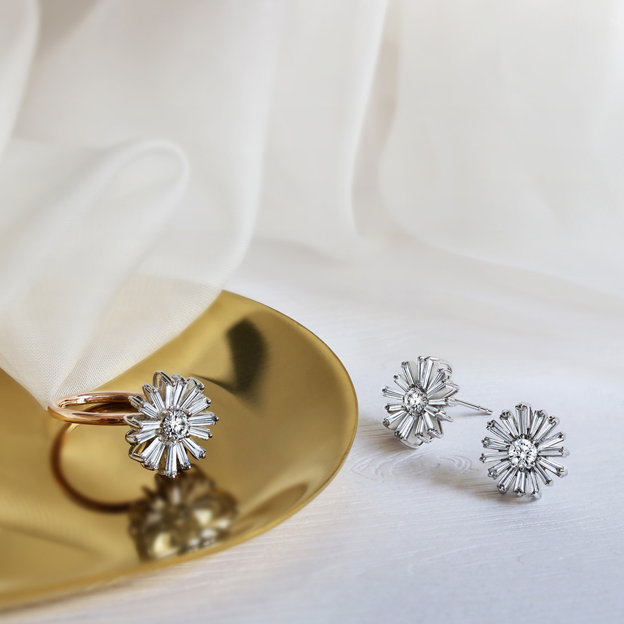 此款為圓鑽車工,精選同比例的梯型花式美鑽巧妙圍著圓形主鑽向外綻放一條條絢麗光徑,彷彿天上燃放的浪漫烟花,點亮令人難忘的夏夜星空。