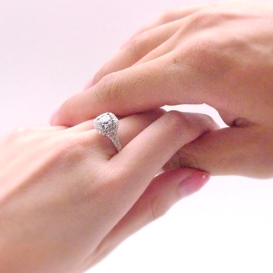 此款為枕形方鑽車工,枕形切割兼顧圓型和公主方的優點,柔合了硬朗的邊角,更受浪漫女性喜愛,在四周鑲崁兩圈小鑽光環圍繞,讓主鑽視覺效果更放大。