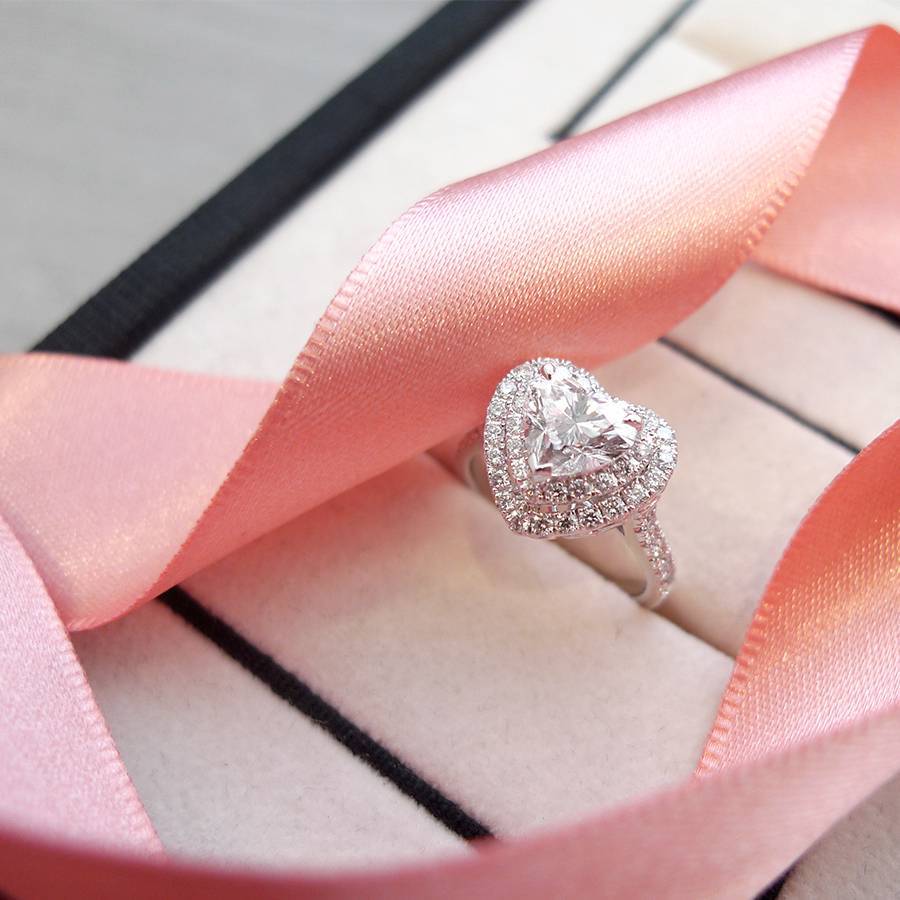 鑽石形狀:愛心形 鑽石重量:0.5克拉、1克拉 (0.5克拉訂價約為6.5萬 ~ 12萬 F/SI2 ~ D/VVS1) (1克拉訂價約為18萬 ~ 40萬 F/SI2 ~ D/VVS1) 配鑽總重:配鑽約0.15克拉 戒 台:可訂製18K、PT950鉑金台