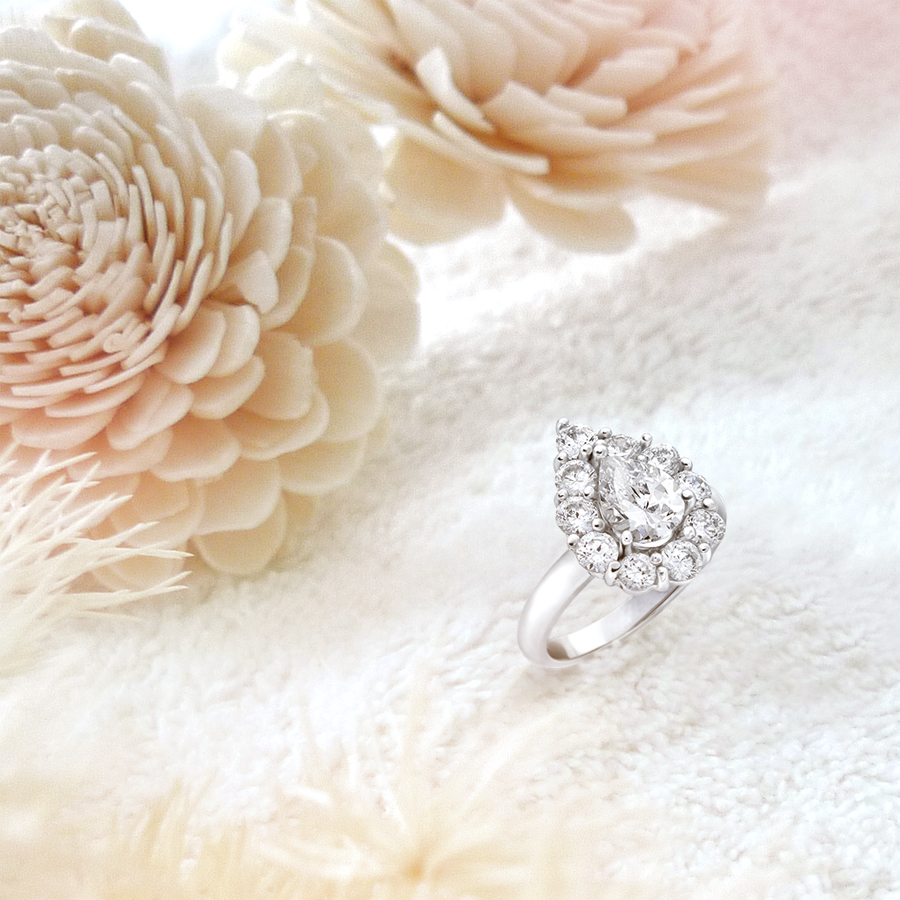 此款為水滴鑽車工,以大顆圓形配鑽圍繞水滴形主石,襯出優雅低奢的內斂光彩,展現含蓄端莊的氣質。