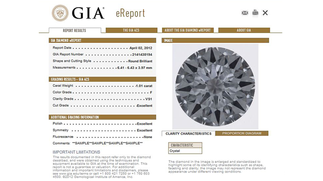 GIA(美國寶石學院)是世界上最具公信力的第三方鑽石認證機構,其出具的GIA 鑽石分級證書在國際範圍內都被認可。自2006年起,GIA開始在全世界範圍內推出GIA鑽石鑑定證書網上查詢系統,而這套系統將採用更為詳盡的GIA Diamond eReport,新服務將為消費者提供更為準確的鑽石信息。