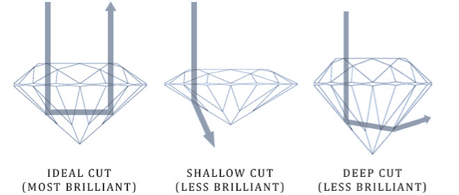 •切割得太淺或太深的鑽石就會把光線由鑽底滑走使鑽石失去光亮。就是說,當一顆鑽石拋光不良時,表面不光滑,則所有反射光會因亂射而發生減弱的現象,光澤會減少,白亮光也會變差。
